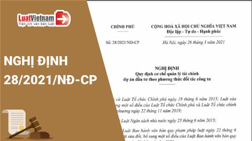 Ngày 26/3/2021, Chính phủ ban hành Nghị định 28/2021/NĐ-CP về việc quy định cơ chế quản lý tài chính dự án đầu tư theo phương pháp đối tác công tư.