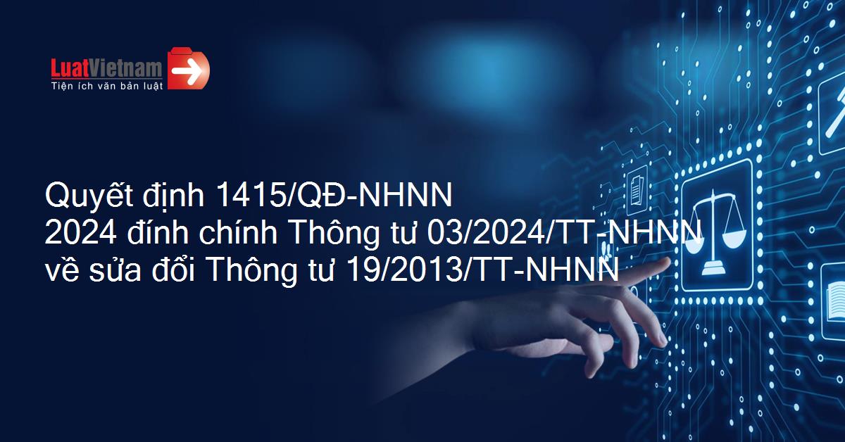Quyết định 1415/QĐ-NHNN 2024 đính chính Thông tư 03/2024/TT-NHNN về sửa đổi Thông tư 19/2013/TT-NHNN
