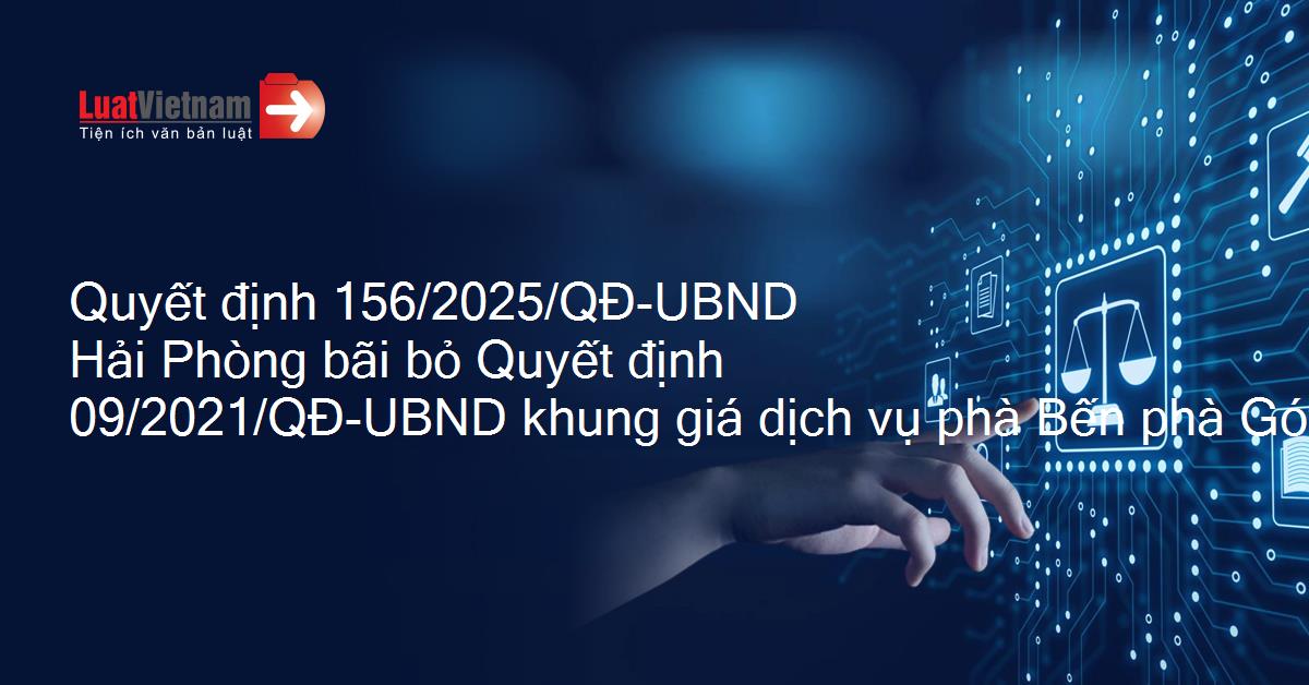 Quyết định 156/2025/QĐ-UBND của Ủy ban nhân dân Thành phố Hải Phòng về việc bãi bỏ Quyết định 09/2021/QĐ-UBND ngày 16/4/2021 của Ủy ban nhân dân thành phố về việc quy định khung giá dịch vụ sử dụng phà tại Bến phà Gót - Cái Viềng, huyện Cát Hải, thành phố Hải Phòng