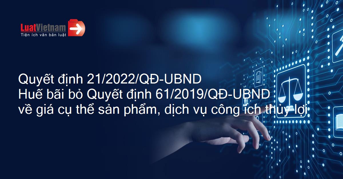 Quyết định 21/2022/QĐ-UBND của Ủy ban nhân dân tỉnh Thừa Thiên Huế về việc bãi bỏ Quyết định 61/2019/QĐ-UBND ngày 04/10/2019 của Ủy ban nhân dân tỉnh Thừa Thiên Huế về việc Quy định giá cụ thể sản phẩm, dịch vụ công ích thủy lợi trên địa bàn tỉnh Thừa Thiên Huế giai đoạn 2019 - 2020