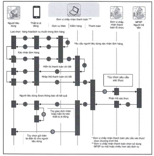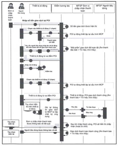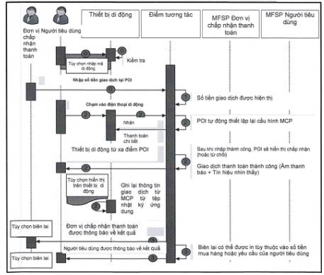 Để thực hiện các giao dịch thanh toán từ xa sử dụng tài khoản giá trị lưu trữ (SVA), người tiêu dùng và đơn vị chấp nhận thanh toán có thể sử dụng hoặc không sử dụng cùng một MFSP. Thanh toán sẽ được thực hiện bằng cách chuyển tiền từ một SVA sang đơn vị chấp nhận thanh toán. Giao dịch sẽ được khởi tạo qua một hệ thống POI từ xa truyền thống và chuyển đến ngân hàng thanh toán để xử lý và hoàn tất giao dịch. MFSP phải tuân thủ các yêu cầu thông báo và biên lai theo các quy định tại 4.4 và 4.5.