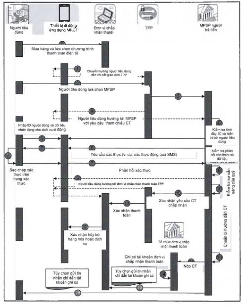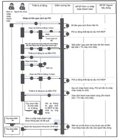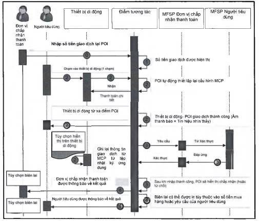 - MFSP thực hiện việc thanh toán giao dịch, dẫn đến việc ghi nợ tài khoản của người tiêu dùng và ghi cò vào tài khoản liên kết với POI.