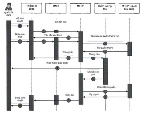Người tiêu dùng ủy quyền giao dịch theo chính sách an toàn của MNO (ví dụ có thể yêu cầu mã PIN tùy thuộc vào cách triển khai).