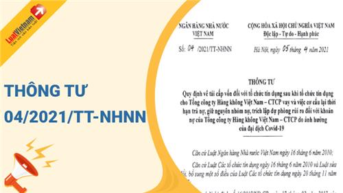 Ngày 05/4/2021, Ngân hàng Nhà nước Việt Nam đã ban hành Thông tư 04/2021/TT-NHNN quy định về tái cấp vốn đối với tổ chức tín dụng sau khi tổ chức tín dụng cho Tổng công ty Hàng không Việt Nam - CTCP vay và việc cơ cấu lại thời hạn trả nợ, giữ nguyên nhóm nợ, trích lập dự phòng rủi ro đối với khoản nợ của Tổng công ty Hàng không Việt Nam - CTCP do ảnh hưởng của đại dịch Covid-19.