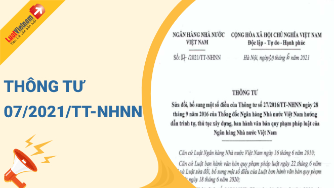 Ngày 30/6/2021, Ngân hàng Nhà nước Việt Nam ban hành Thông tư 07/2021/TT-NHNN về việc sửa đổi, bổ sung một số điều của Thông tư 27/2016/TT-NHNN ngày 28/9/2016 của Thống đốc Ngân hàng Nhà nước Việt Nam hướng dẫn trình tự, thủ tục xây dựng, ban hành văn bản quy phạm pháp luật của Ngân hàng Nhà nước Việt Nam.