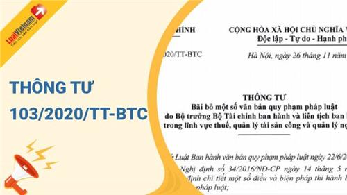Ngày 26/11/2020, Bộ Tài chính ban hành Thông tư 103/2020/TT-BTC về việc bãi bỏ một số văn bản quy phạm pháp luật do Bộ trưởng Bộ Tài chính ban hành và liên tịch ban hành trong lĩnh vực thuế, quản lý tài sản công và quản lý nợ công.