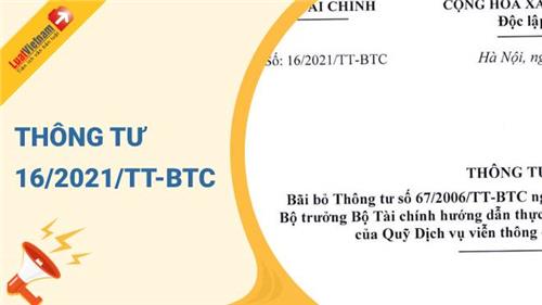 Ngày 19/02/2021, Bộ Tài chính đã ban hành Thông tư 16/2021/TT-BTC về việc bãi bỏ Thông tư 67/2006/TT-BTC ngày 18/7/2006 của Bộ trưởng Bộ Tài chính hướng dẫn thực hiện chế độ quản lý tài chính của Quỹ Dịch vụ viễn thông công ích Việt Nam.