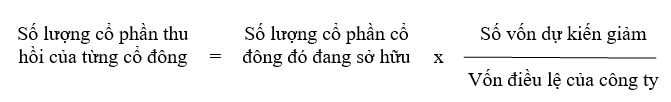 - Mỗi cổ đông trong công ty bị thu hồi một số lượng cổ phần theo tỷ lệ giữa số vốn dự kiến được điều chỉnh giảm với tổng mức vốn điều lệ của công ty tại thời điểm trước khi điều chỉnh.