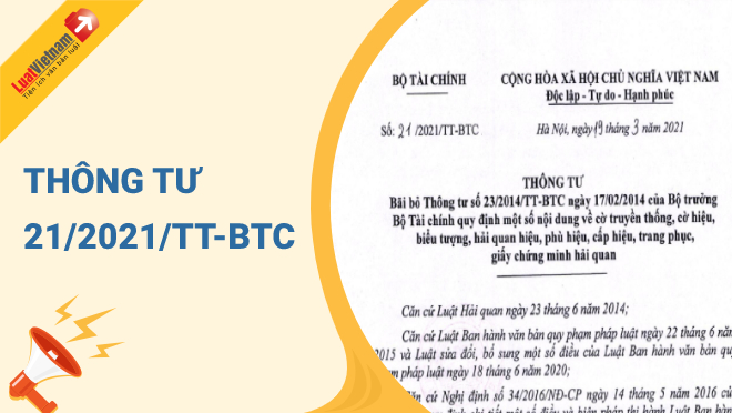 Ngày 19/3/2021, Bộ Tài chính ban hành Thông tư 05/2021/TT-BGDĐT về việc bãi bỏ Thông tư 23/2014/TT-BTC ngày 17/02/2014 của Bộ trưởng Bộ Tài chính quy định một số nội dung về cờ truyền thống, cờ hiệu, biểu tượng, hải quan hiệu, phù hiệu, cấp hiệu, trang phục, giấy chứng minh hải quan.