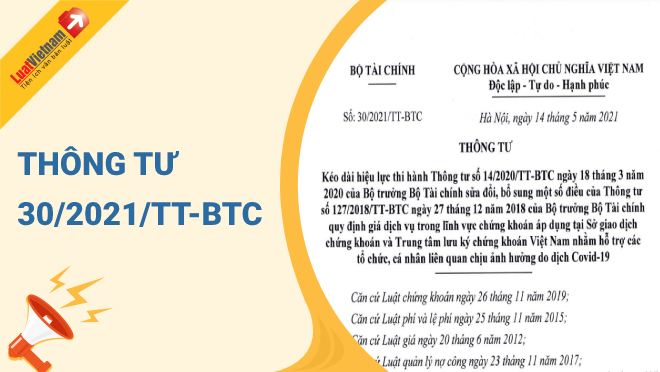 Ngày 14/5/2021, Bộ Tài chính ban hành Thông tư 30/2021/TT-BTC về việc kéo dài hiệu lực thi hành Thông tư 14/2020/TT-BTC ngày 18/3/2020 của Bộ trưởng Bộ Tài chính sửa đổi, bổ sung một số điều của Thông tư 127/2018/TT-BTC ngày 27/12/2018 của Bộ trưởng Bộ Tài chính quy định giá dịch vụ trong lĩnh vực chứng khoán áp dụng tại Sở giao dịch chứng khoán và Trung tâm lưu ký chứng khoán Việt Nam nhằm hỗ trợ các tổ chức, cá nhân liên quan chịu ảnh hưởng do dịch Covid-19.