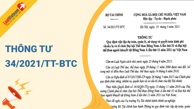 Ngày 19/5/2021, Bộ Tài chính ban hành Thông tư 34/2021/TT-BTC quy định việc lập dự toán, quản lý, sử dụng và quyết toán kinh phí chuẩn bị và tổ chức Đại hội Thể thao Đông Nam Á lần thứ 31 và Đại hội thể thao người khuyết tật Đông Nam Á lần thứ 11 năm 2021 tại Việt Nam.