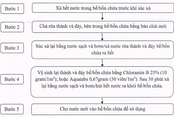- Quy trình súc xả bể/bồn chứa nước: Trung tâm Kiểm soát bệnh tật thành phố đề xuất quy trình vệ sinh bể/bồn chứa nước như sau: