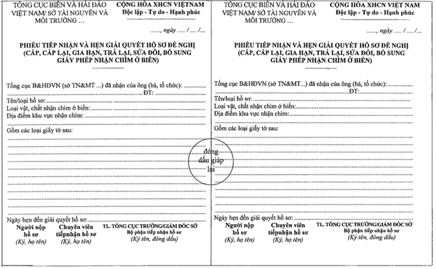 Xét Đơn và hồ sơ đề nghị (cấp, gia hạn, sửa đổi, bổ sung Giấy phép nhận chìm ở biển) ngày ... tháng ... năm ... của (tên tổ chức, cá nhân)... nộp tại Tổng cục Biển và Hải đảo Việt Nam (Sở Tài nguyên và Môi trường tỉnh, thành phố...);