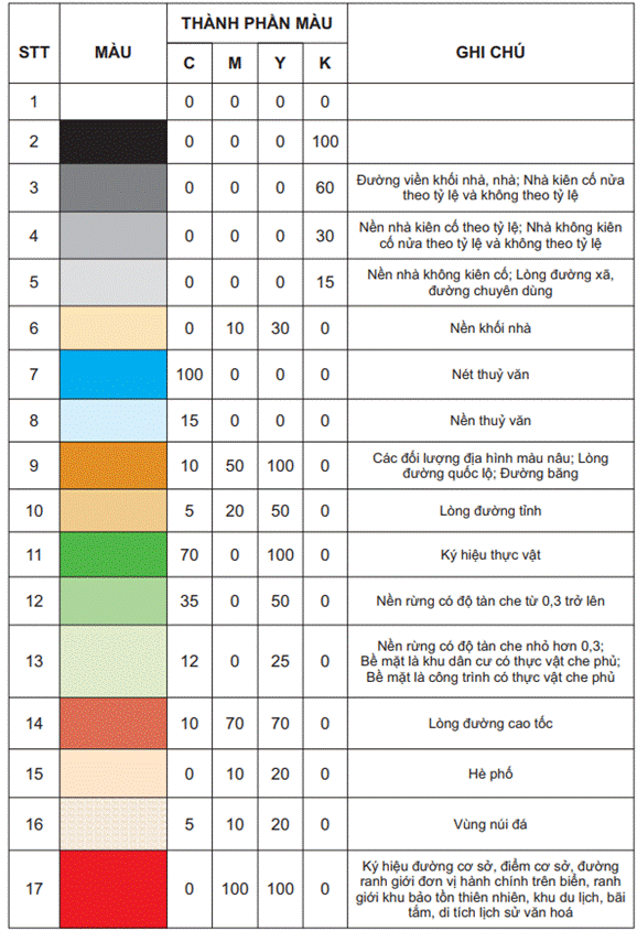 Phụ lục A (Quy định) Bảng màu và thành phần màu của các ký hiệu trên bản đồ địa hình quốc gia tỷ lệ 1:10.000