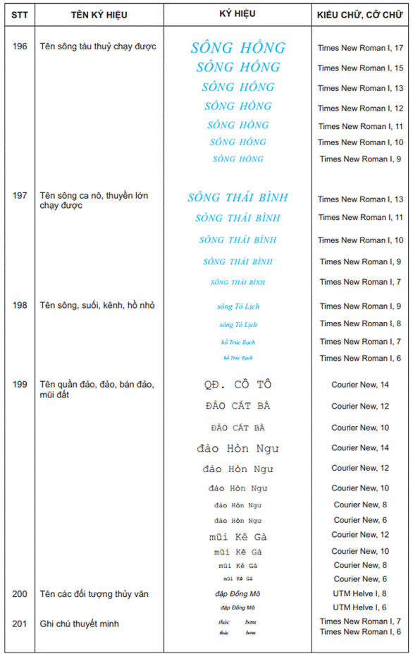 4.6 Đơn vị tính các giá trị đo biểu thị trên bản đồ: độ cao, độ sâu, chiều cao, chiều dài, chiều rộng, tỷ cao, tỷ sâu tính bằng mét (m); trọng tải cầu, phà tính bằng tấn (t); điện áp tính bằng kilôvôn (kV).
