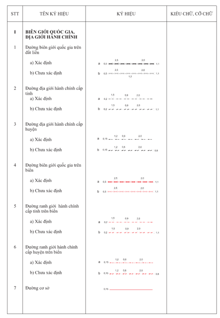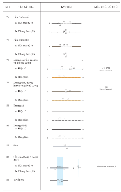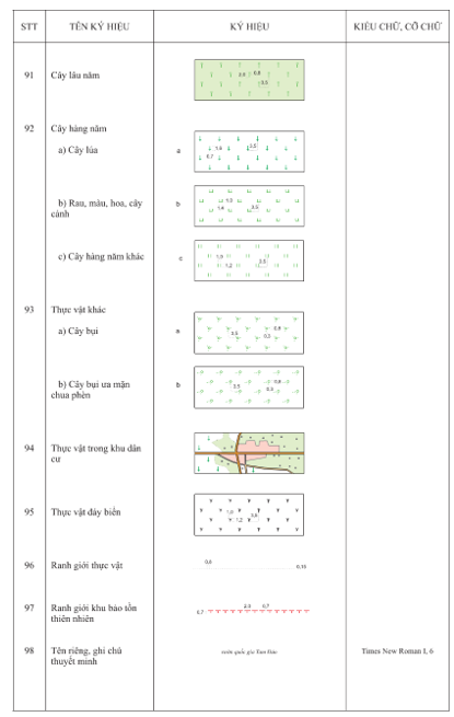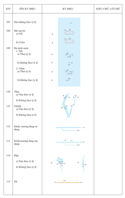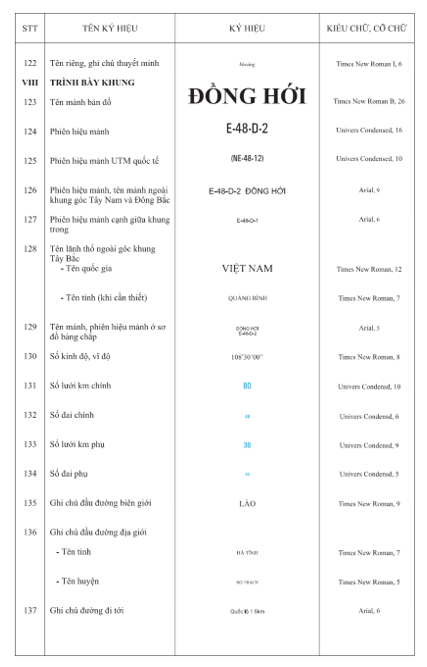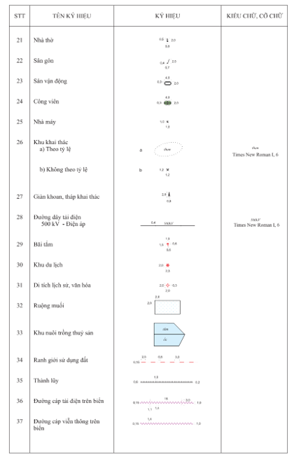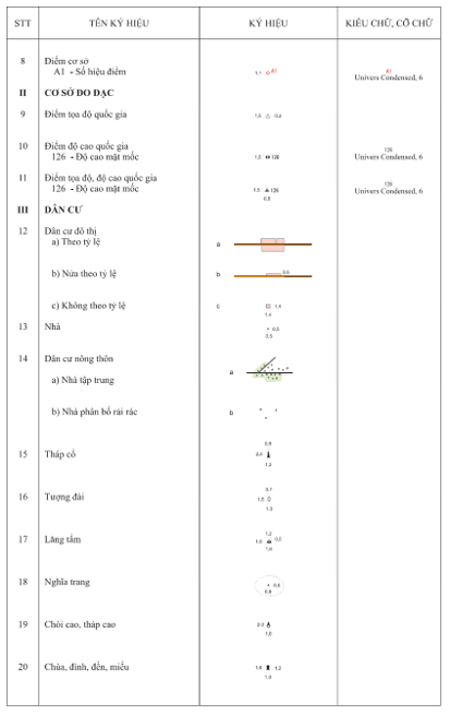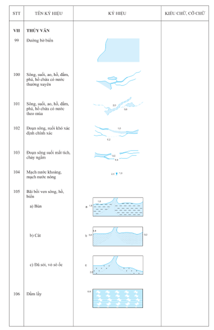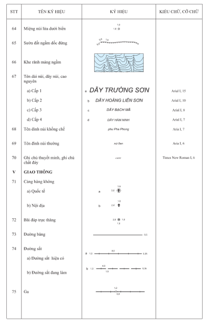 3.2.1 Kích thước của các ký hiệu, chữ ghi chú được tính theo kích thước trên bản đồ in ở đúng tỷ lệ bản đồ. Đơn vị tính kích thước ký hiệu là milimet (mm). Đơn vị tính cỡ chữ ghi chú là point (pt).