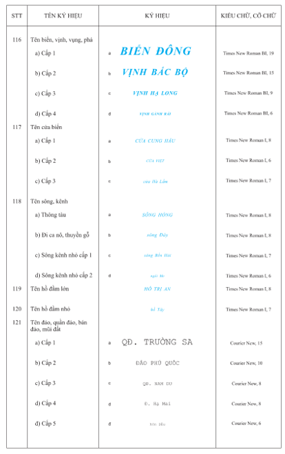 2.9.8.5 Thể hiện tên các đảo có diện tích trên bản đồ có diện tích từ 2 mm2 trở lên, đối với khu vực tập trung nhiều đảo có diện tích nhỏ thì chỉ thể hiện tên các đảo lớn. Các đảo có diện tích nhỏ hơn 2 mm2, bãi ngầm, mũi đất nhỏ nhưng có ý nghĩa quan trọng phải thể hiện đầy đủ tên gọi.