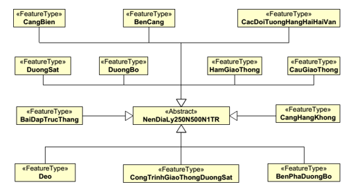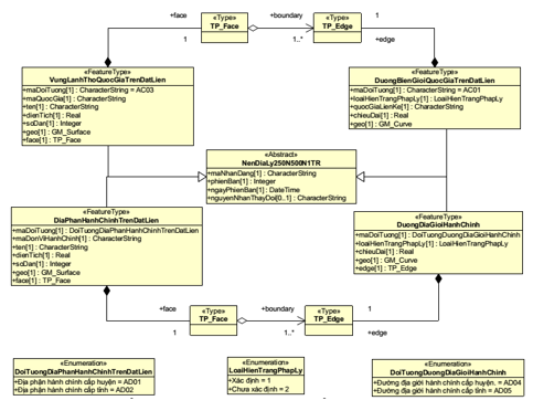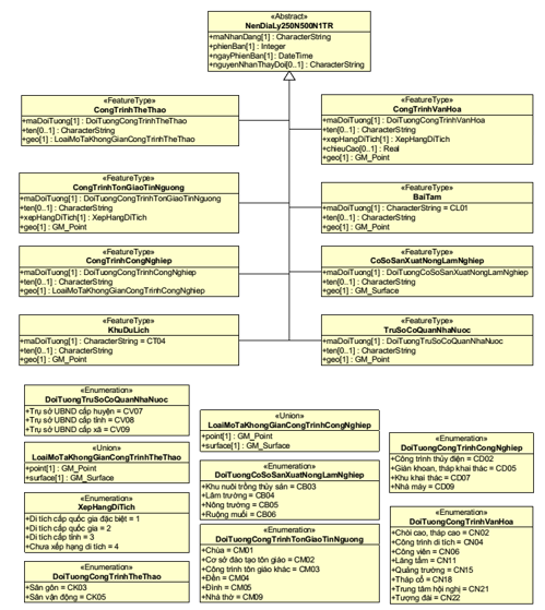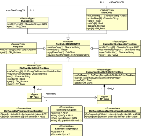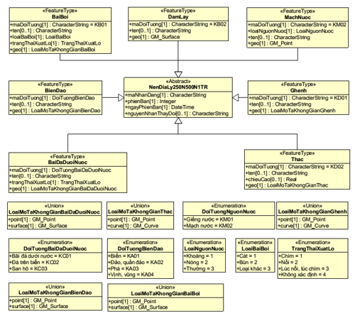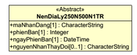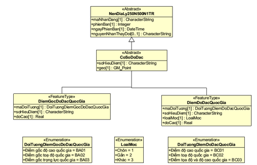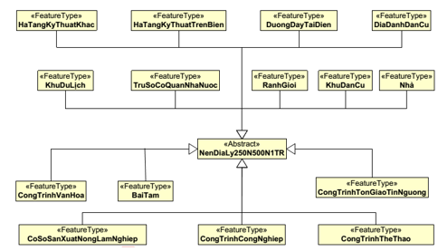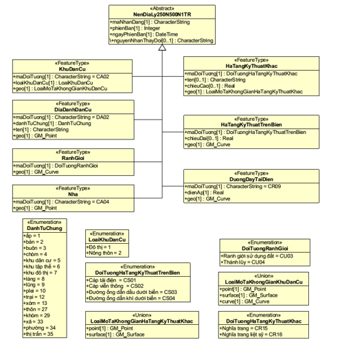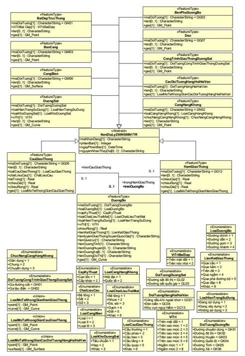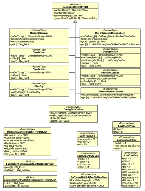 | Mô tả | NenDiaLy250N500N1TR là lớp UML trừu tượng mô tả các đặc tính chung của tất cả các đối tượng địa lý thuộc dữ liệu nền địa lý tỷ lệ 1:250.000, 1:500.000, 1: 1.000.000. |