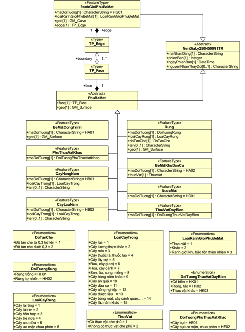 | PhuBeMat | Quy định cấu trúc dữ liệu của gói dữ liệu phủ bề mặt gồm lớp phủ thực vật, lớp sử dụng đất, lớp nước mặt, lớp phủ công trình và các lớp phủ khác. |