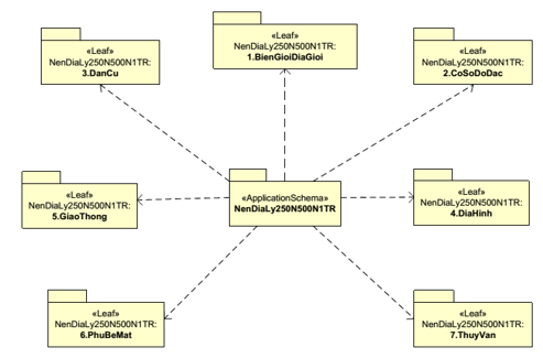 Mô hình cấu trúc cơ sở dữ liệu nền địa lý quốc gia tỷ lệ 1:250.000, 1:500.000, 1:1.000.000 được tổ chức gồm 07 gói UML theo 07 chủ đề dữ liệu địa lý như hình dưới đây: