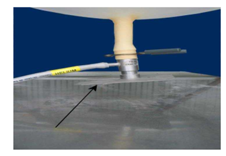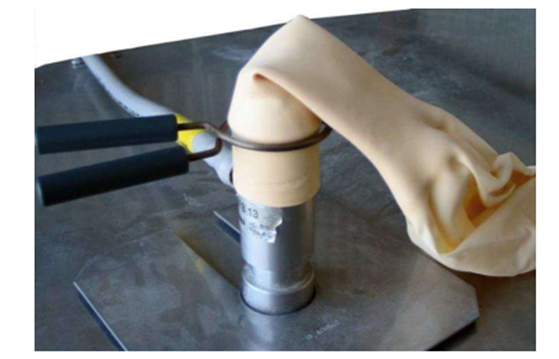 - Buộc chặt cổ bóng bằng dây mềm, thắt nút đoạn dây thừa rồi nhẹ nhàng tháo cổ bóng ra khỏi chén cân, móc dây vào chốt cố định dưới sàn bơm bóng; xếp gọn cổ bóng rồi gấp đôi lên lần nữa, buộc chặt; dùng mỏ tời luồn vào khe vừa gấp đôi ở cổ bóng (hình 3);