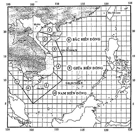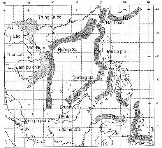 Tên các vùng nguồn đánh số trên bản đồ: 1 - vùng nguồn biển Đài Loan, 2 - vùng nguồn Máng biển sâu Manila, 3 - vùng nguồn Biển Sulu, 4 - vùng nguồn Biển Selebes, 5 - vùng nguồn Biển Ban đa Nam, 6 - vùng nguồn Biển Ban đa Bắc, 7 - vùng nguồn Bắc Biển Đông, 8 - vùng nguồn Pa la oan, 9 - vùng nguồn Tây Biển Đông (Kinh tuyến 109°).