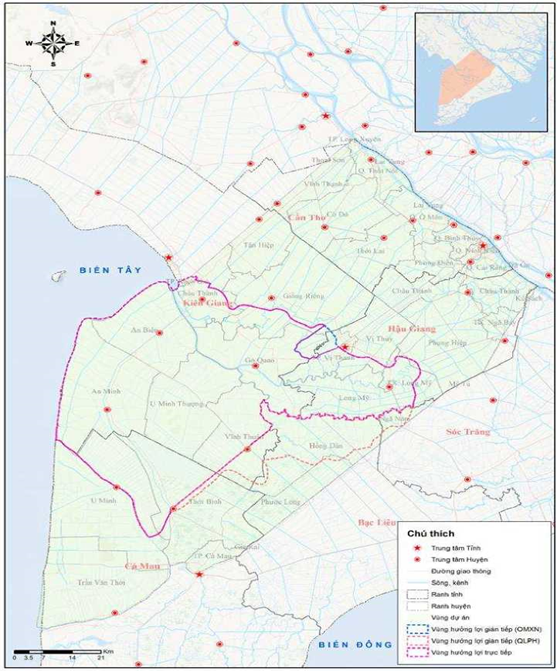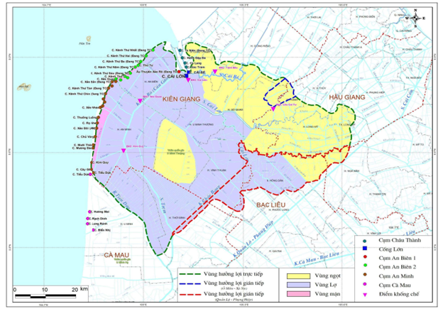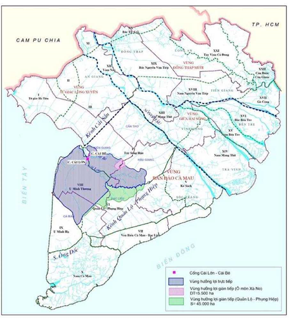 1. Kiểm soát nguồn nước (mặn, lợ, ngọt), tạo điều kiện sản xuất ổn định, bền vững đối với các mô hình sản xuất theo hệ sinh thái (ngọt, mặn - lợ, ngọt - lợ luân phiên) cho vùng hưởng lợi với diện tích tự nhiên 384.120 ha (diện tích hưởng lợi trực tiếp là 333.620 ha, dện tích hỗ trợ là 50.500 ha); trong đó, đất sản xuất nông nghiệp là 346.241 ha;