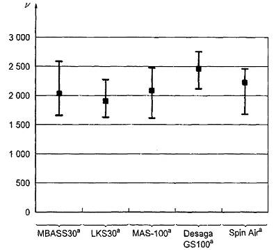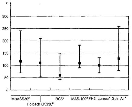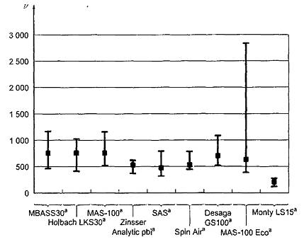 35 phòng thử nghiệm sử dụng thiết bị lấy mẫu khác nhau (số lượng thiết bị lấy mẫu được sử dụng trong ngoặc đơn): Holbach LKS301) (13), MBASS301) (15), MAS-1001) (5), Spin Air1) (1) và Desaga GS1001) (1). Các kết quả giống nhau của MBASS, LKS30 và MAS-100 (xem Hình C.8). Còn Spin Air và Desaga GS100 cho các kết quả hơi cao hơn mặc dù việc so sánh là khó vì số lượng kết quả sử dụng các thiết bị lấy mẫu này thấp.
