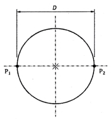 Chiều dài (D) của đoạn thẳng đi qua tâm, từ một điểm (P1) đến điểm khác (P2) trên mặt cắt ngang khúc mây và ruột tròn.