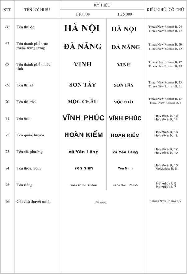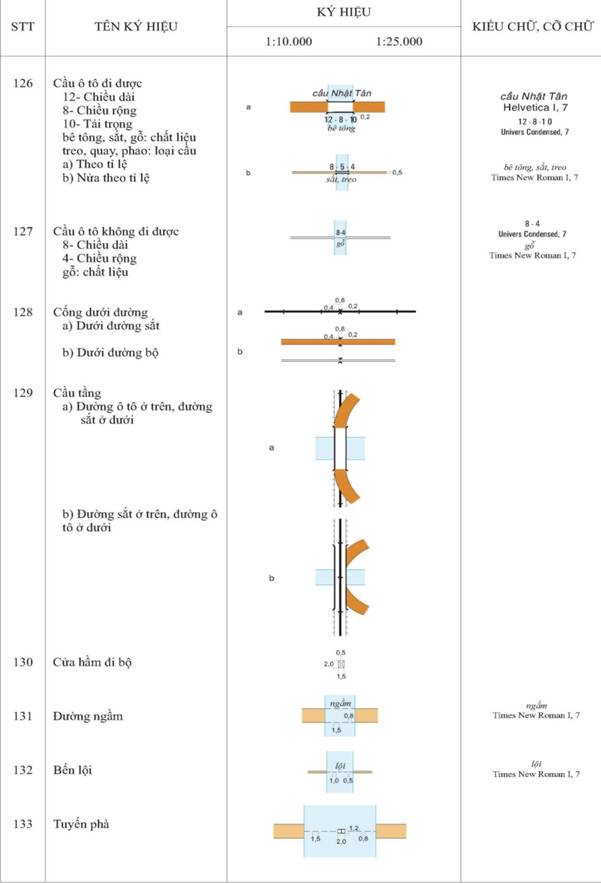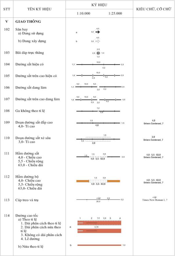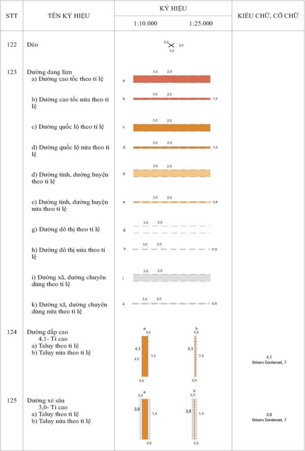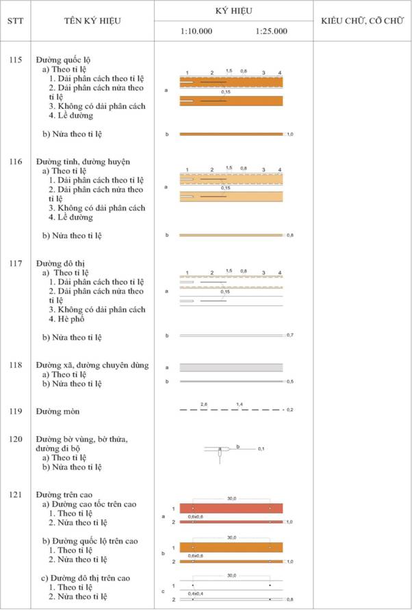 Đồng thời, nội dung bản đồ địa hình quốc gia tỷ lệ 1:10.000, 1:25.000 được thể hiện theo các quy định sau: Thể hiện bằng ký hiệu theo tỷ lệ khi các đối tượng địa lý hình tuyến có chiều rộng đạt từ 5,0 m trở lên đối với tỷ lệ 1:10.000 và 12,5 m trở lên đối với tỷ lệ 1:25.000; đối với các đối tượng địa lý dạng vùng nguyên tắc thể hiện bằng ký hiệu theo tỷ lệ được quy định chi tiết theo từng nhóm dữ liệu bản đồ.