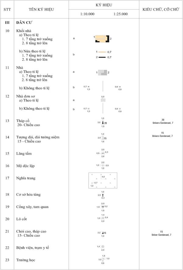 Cần lưu ý, đối với tỷ lệ 1:10.000, nhà có diện tích nhỏ hơn 70,0 m2 và nhà có chiều rộng nhỏ hơn 7 m thì biểu thị bằng ký hiệu nhà phi tỷ lệ. Đối với tỷ lệ 1:25.000, nhà có diện tích nhỏ hơn 500,0 m2 và nhà có chiều rộng nhỏ hơn 20 m thì biểu thị bằng ký hiệu nhà phi tỷ lệ.