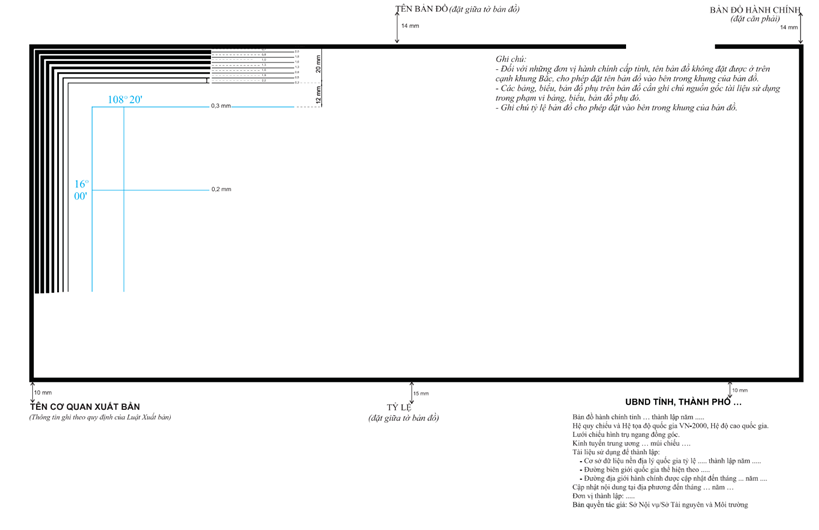 Bản đồ hành chính Việt Nam trình bày khung và nội dung ngoài khung theo đúng quy định tại Phụ lục 5a của Thông tư số 47/2014/TT-BTNMT ngày 22 tháng 8 năm 2014 của Bộ trưởng Bộ Tài nguyên và Môi trường quy định kỹ thuật thành lập bản đồ hành chính các cấp (hoặc QCVN ...) |