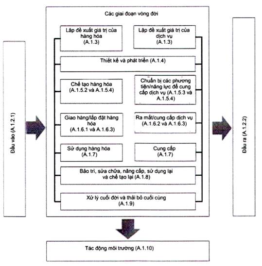 CHÚ THÍCH 1: Ví dụ về các giai đoạn liên kết với nhau đối với hàng hóa bao gồm tạo ra đề xuất giá trị, thiết kế và phát triển, chế tạo hàng hóa, giao/lắp đặt hàng hóa, sử dụng hàng hóa, bảo trì, sửa chữa, nâng cấp, sử dụng lại, chế tạo lại, xử lý cuối đời và thải bỏ cuối cùng.