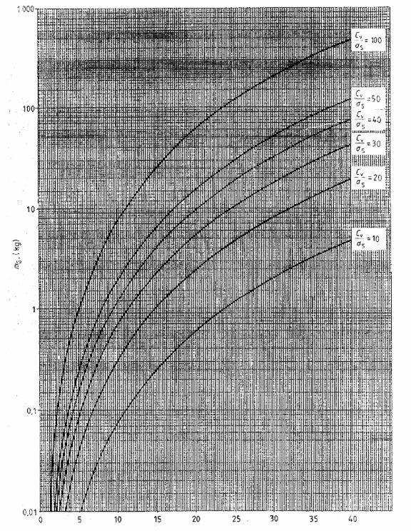 Để tính khối lượng mẫu tối thiểu mG, tính bằng kg, giả thiết rằng các hạt quặng có hình cầu với đường kính D, tính bằng mm, và có khối lượng riêng r, tính bằng tấn trên mét khối.