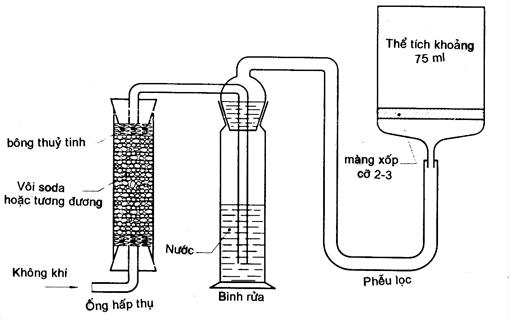 5.2 Khí, không chứa cacbon dioxit, nitơ hoặc khí khác thu được bằng cách cho không khí đi qua ống đựng vôi soda hoặc chất khác hấp thụ cacbon dioxit. Sau đó cho khí đi qua bình rửa chứa nước và cuối cùng đi vào ống phân phối khí (hình 1).