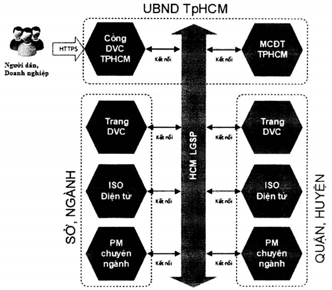 Cổng Dịch vụ công và Hệ thống thông tin Một cửa điện tử được kết nối với nhau thông qua nền tảng triển khai Chính quyền điện tử Thành phố Hồ Chí Minh (HCM LGSP).