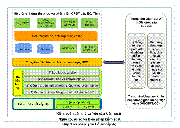 Công tác bảo đảm an toàn thông tin nói chung và công tác bảo đảm an toàn thông tin trong CPĐT, CQĐT và ĐTTM phải được thực hiện một cách tổng thể, đồng bộ theo chỉ đạo của Thủ tướng Chính phủ tại Chỉ thị số 14/CT-TTg ngày 06/7/2019. Theo đó, cơ quan, tổ chức triển khai bảo đảm an toàn thông tin cho hệ thống thông tin thuộc phạm vi quản lý theo mô “4 lớp”: (1) Lực lượng tại chỗ, (2) Tổ chức hoặc doanh nghiệp giám sát, bảo vệ chuyên nghiệp, (3) Tổ chức hoặc doanh nghiệp độc lập kiểm tra, đánh giá định kỳ, (4) Kết nối, chia sẻ thông tin với hệ thống giám sát quốc gia.