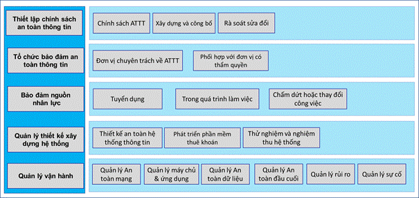 Các yêu cầu cụ thể được xác định dựa vào cấp độ của hệ thống thông tin tương ứng cần bảo vệ và được chia ra làm 05 nhóm: (1) Chính sách an toàn thông tin, (2) Tổ chức bảo đảm an toàn thông tin, (3) Bảo đảm nguồn nhân lực, (4) Quản lý thiết kế, xây dựng hệ thống, (5) Quản lý vận hành an toàn hệ thống thông tin, chi tiết tham khảo tại Phụ lục hướng dẫn này.