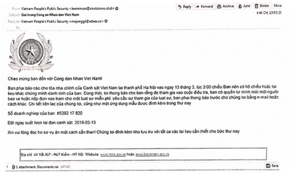 Tuy nhiên, hiện nay qua theo dõi không gian mạng, Trung tâm VNCERT phát hiện từ giữa tháng 3/2019 đến nay đang có chiến dịch phát tán Mã độc tống tiền GandCrab 5.2 vào Việt Nam và các nước Đông Nam Á. Tại Việt Nam, GandCrab 5.2 được phát tán thông qua thư điện tử giả mạo Bộ Công an Việt Nam với tiêu đề “Goi trong Cong an Nhan dan Viet Nam”, có đính kèm tệp documents.rar. Khi người dùng giải nén và mở tệp tin đính kèm, mã độc sẽ được kích hoạt và toàn bộ dữ liệu người dùng bị mã hóa, đồng thời sinh ra một tệp nhằm yêu cầu và hướng dẫn người dùng trả tiền chuộc từ 400 - 1.000 USD bằng cách thanh toán qua đồng tiền điện tử để giải mã dữ liệu.