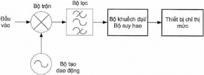 Máy thu đo công suất được dùng trong phép đo công suất kênh lân cận của máy phát, bao gồm: một bộ trộn và một máy tạo dao động, một bộ lọc IF, một bộ khuếch đại, một bộ suy hao biến đổi và thiết bị chỉ thị mức như mô tả trong Hình A.1.