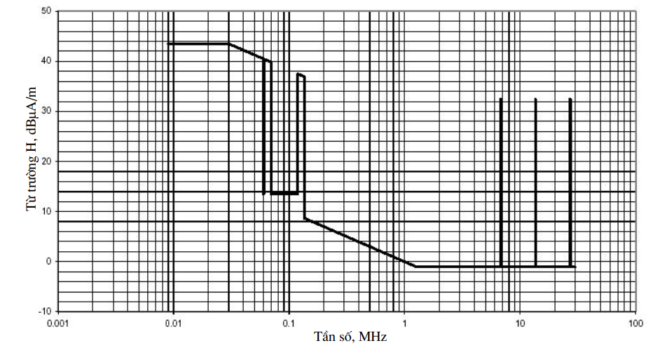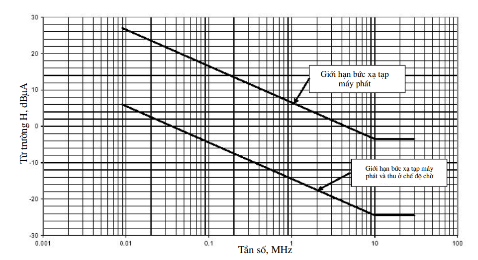 | 4 | 37,7 dBmA/m đo cách 10 m (tại 135 kHz, giảm 3 dB/8 độ chia từ 135 kHz đến 1 MHz) 29 dBmA/m đo cách 10 m (tại 1 MHz, giảm 9 dB/8 độ chia từ 1 MHz đến 4,642 MHz) |