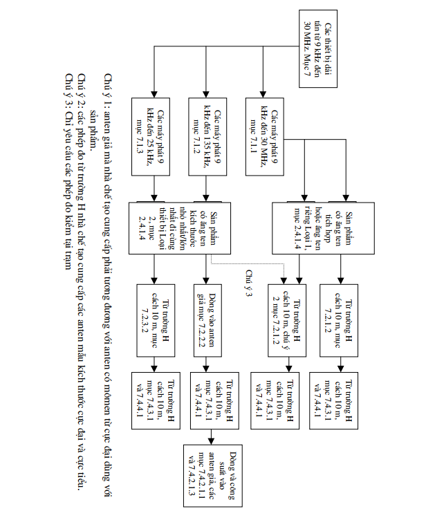 1. QUY ĐỊNH CHUNG. 1.1. Phạm vi điều chỉnh. 1.2. Đối tượng áp dụng. 1.3. Tài liệu viện dẫn. 1.4. Giải thích từ ngữ. 1.4.1. Định nghĩa. 1.4.2. Ký hiệu. 1.4.3. Chữ viết tắt 2. QUY ĐỊNH KỸ THUẬT. 2.1 Yêu cầu kỹ thuật 2.1.1 Các yêu cầu chung. 2.1.2 Mô tả thiết bị cần đo kiểm. 2.1.3 Thiết kế điện và cơ khí 2.1.4 Các công bố của bên có thiết bị cần đo kiểm. 2.1.5 Thiết bị kiểm tra phụ trợ. 2.1.6 Diễn giải các kết quả đo. 2.2 Điều kiện đo kiểm, nguồn điện và nhiệt độ môi trường. 2.2.1 Điều kiện đo kiểm bình thường và tới hạn. 2.2.2 Nguồn điện đo kiểm. 2.2.3 Điều kiện đo kiểm bình thường. 2.2.4 Điều kiện đo kiểm tới hạn. 2.3 Điều kiện chung. 2.3.1 Tín hiệu và quá trình điều chế đo kiểm bình thường. 2.3.2 Ăng ten giả. 2.3.3 Bộ ghép đo. 2.3.4 Vị trí đo kiểm và sơ đồ đo chung đối với các phép đo bức xạ. 2.3.5 Chế độ hoạt động của máy phát 2.3.6 Máy thu đo. 2.4 Các yêu cầu máy phát 2.4.1 Phân loại máy phát 2.4.2 Mức công suất sóng mang của máy phát 2.4.3 Dải tần cho phép của băng thông điều chế. 2.4.4 Phát xạ giả. 2.4.5 Chu kỳ hoạt động. 2.5 Yêu cầu đối với máy thu. 2.5.1 Độ chọn lọc kênh lân cận-trong dải 2.5.2 Giảm độ nhạy thu đối với tín hiệu không mong muốn. 2.5.3 Phát xạ giả của máy thu. 2.6 Độ không đảm bảo đo. 3. QUY ĐỊNH VỀ QUẢN LÝ. 4. TRÁCH NHIỆM CỦA TỔ CHỨC, CÁ NHÂN. 5. TỔ CHỨC THỰC HIỆN. Phụ lục A (Quy định) Phép đo bức xạ. Phụ lục B (Quy định) Các giới hạn sóng mang máy phát Phụ lục C (Quy định) Giới hạn dòng sóng mang RFx tiết diện ăng ten máy phát đối với vòng kích thước lớn. Phụ lục D (Quy định) Hệ số hiệu chỉnh giới hạn trường H đối với các trường E được phát Phụ lục E (Quy định) Các giới hạn phát xạ giả, trường H bức xạ tại các khoảng cách 10m. Phụ lục F (Quy định) Các ăng ten vòng chế tạo theo yêu cầu của khách hàng. Phụ lục G (Tham khảo) Bộ ghép đo dòng sóng mang và hài máy phát cảm ứng sử dụng ăng ten giả (chỉ đối với sản phẩm nhóm 3) Phụ lục H (Tham khảo) Các trường E trong trường gần tại các tần số thấp. Phụ lục I (Tham khảo) Các phép đo trường H tại khoảng cách khác 10m. Phụ lục J (Tham khảo) Tóm tắt các yêu cầu đối với máy phát Phụ lục K (Tham khảo) Các phép đo dạng phổ máy phát mức thấp.