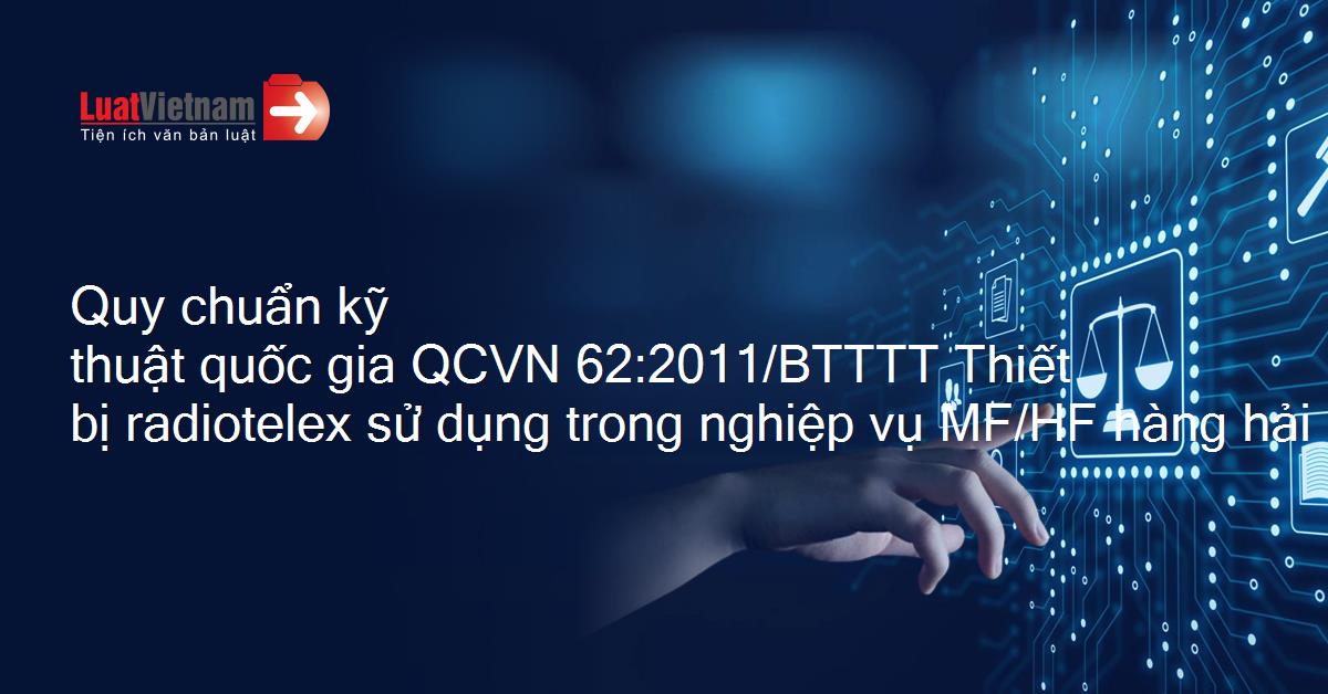 | QCVN 62:2011/BTTTT được xây dựng trên cơ sở soát xét cập nhật TCN 68-204:2001 “Thiết bị Radiotelex sử dụng trong các nghiệp vụ MF/HF hàng hải - Yêu cầu kỹ thuật” ban hành kèm theo Quyết định số 1059/2001/QĐ-TCBĐ ngày 21 tháng 12 năm 2001. QCVN 62:2011/BTTTT hoàn toàn tương đương tiêu chuẩn ETS 300 067 của Viện Tiêu chuẩn Viễn thông châu Âu (ETSI). QCVN 62:2011/BTTTT do Viện Khoa học Kỹ thuật Bưu điện biên soạn, Vụ Khoa học và Công nghệ trình duyệt và được ban hành theo Thông tư số 29/TT-BTTTT ngày 26 tháng 10 năm 2011 của Bộ trưởng Bộ Thông tin và Truyền thông. |