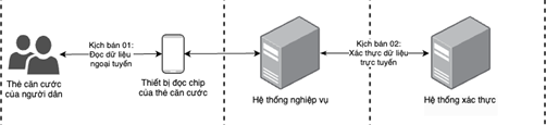 - Kịch bản 02 - đọc thông tin trong chip của thẻ căn cước và xác thực dữ liệu trực tuyến: Thực hiện đọc thông tin có sẵn trong chip của thẻ căn cước bằng thiết bị đọc chip của thẻ căn cước và xác thực dữ liệu thông qua kết nối trực tuyến.