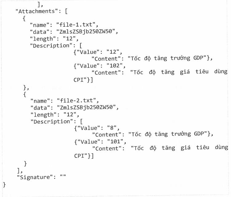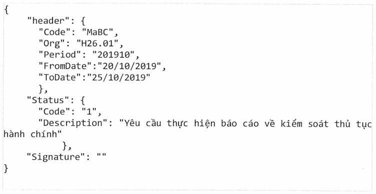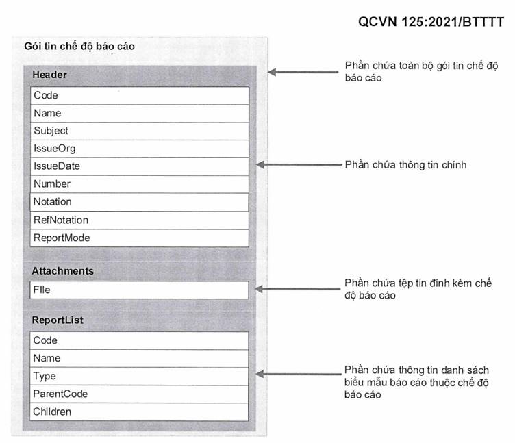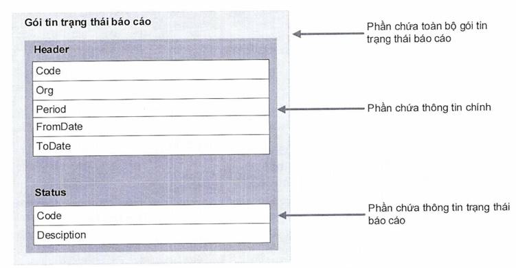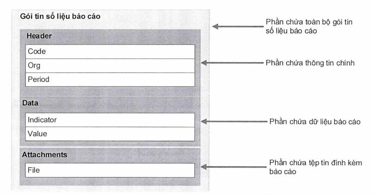 | 1 | Gói tin số liệu báo cáo | Chữ ký số của người có thẩm quyền ban hành báo cáo/cơ quan ban hành báo cáo |