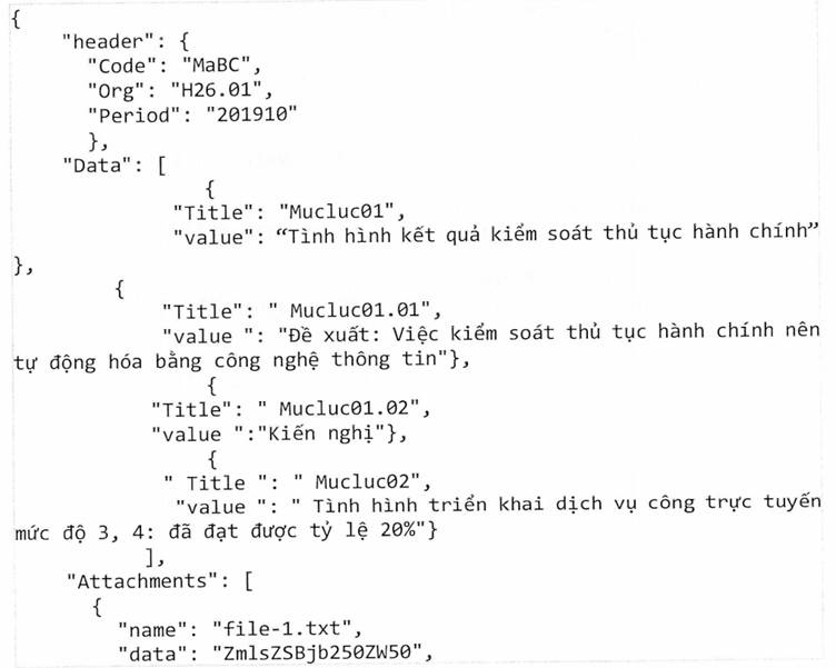 Đây là Ví dụ minh họa định dạng, giá trị các trường thông tin gói tin gửi đề cương báo cáo được mô tả trong Bảng 14 để các cơ quan, đơn vị tham khảo: