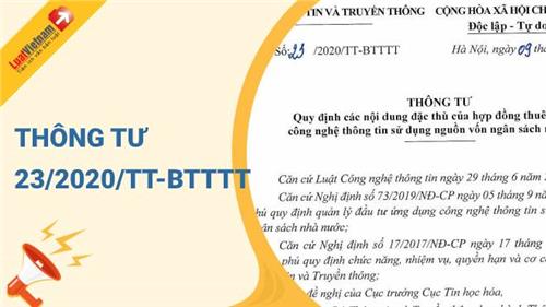 Ngày 9/9/2020, Bộ Thông tin và Truyền thông ban hành Thông tư 23/2020/TT-BTTTT về việc quy định các nội dung đặc thù của hợp đồng thuê dịch vụ công nghệ thông tin sử dụng nguồn vốn ngân sách Nhà nước.