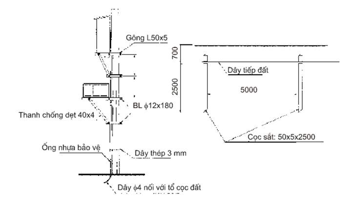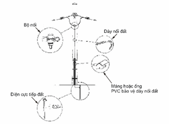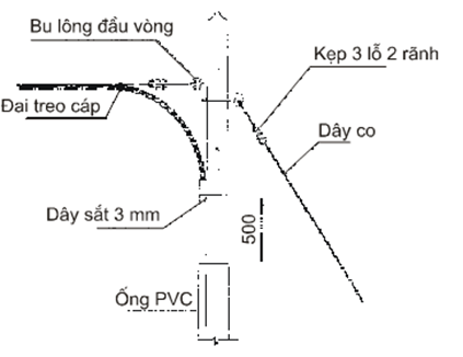 c) Dây nối đất là loại thép bện, gồm có 4 sợi thép mạ kẽm, đường kính mỗi sợi 1,9 mm. Dây nối đất phải được đặt trong ống hoặc máng nhựa bảo vệ PVC.