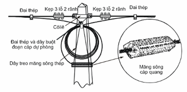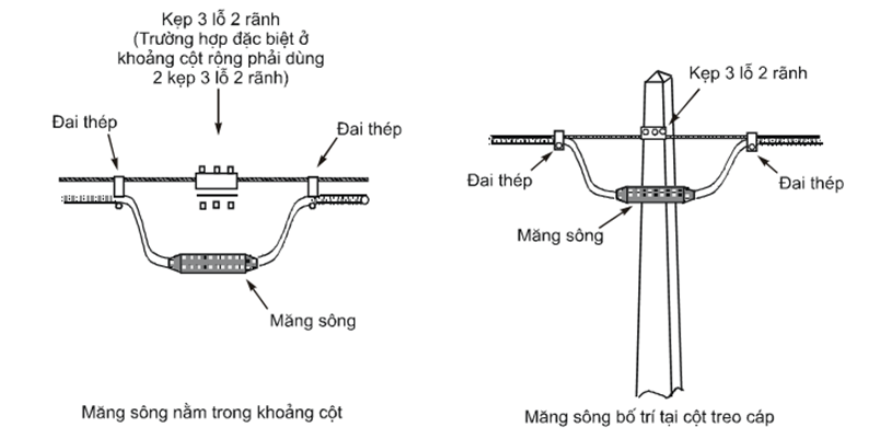 a) Măng sông cáp quang treo được bố trí tại các cột. Cáp quang tại cột có treo măng sông cần để mỗi đầu dôi ra tối thiểu là 12 m. Các mẫu cáp quang dôi ra này sẽ được quấn tròn và treo gọn ngay trên cột. Mục đích của các mẫu cáp quang dôi ra này là phục vụ cho việc hàn nối sửa chữa sau này.