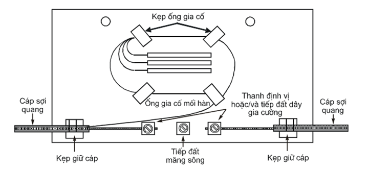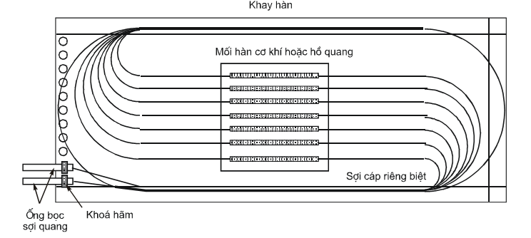 b) Sau khi hàn nối sợi quang xong phải cẩn thận đưa mối hàn vào trong khay hàn. Bán kính cong của sợi quang phải bảo đảm lớn hơn 20 lần đường kính cáp.
